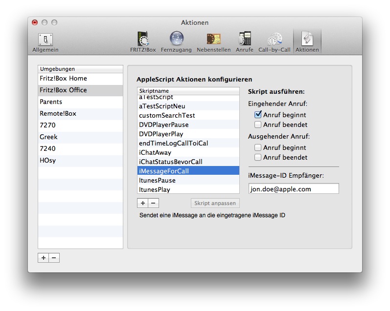 Dial!List bietet die Möglichkeit, AppleScript-Aktionen bei Beginn und Ende eines Gespräches automatisch auszuführen. Hierfür werden bereits viele nützliche AppleScript-Aktionen mitgeliefert. Zum Beispiel können Sie bei Start eines Telefonates Ihren iChat- oder Adium-Status auf abwesend setzen, iTunes oder DVD Player pausieren, oder ganz einfach die Systemlautstärke deaktivieren.