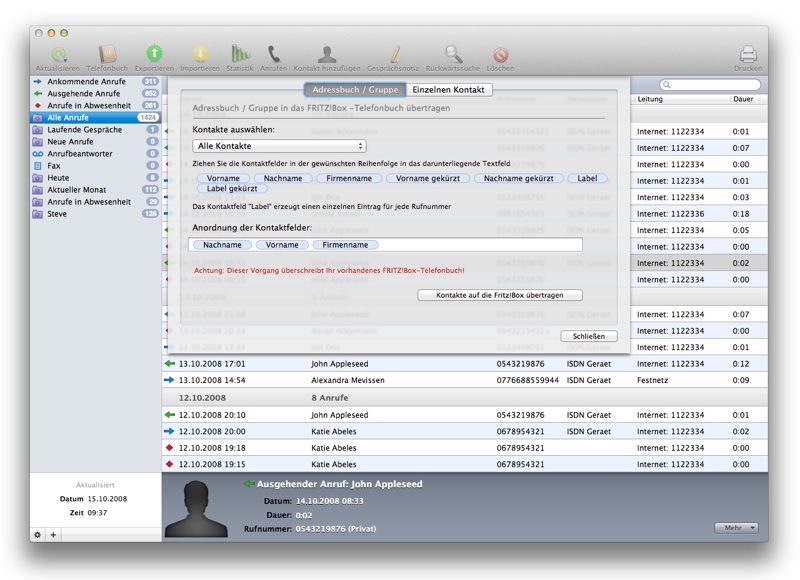 Die Anrufliste wird automatisch nach jedem Anruf von der FRITZ!Box geladen.Diese können Sie nach Kategorien gruppiert ansehen und durchsuchen. Der Anruf wird mit den Kontaktdetails aus Ihrem Adressbuch ergänzt.