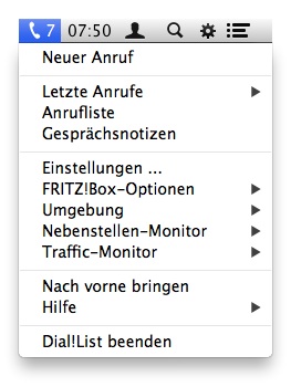 Der Zugriff auf alle Funktionen von Dial!List geschieht aus der Menüleiste von Mac OS X aus.Der Menüeintrag zeigt Ihnen auch auf Wunsch neue Anrufe und Anrufe in Abwesenheit an.