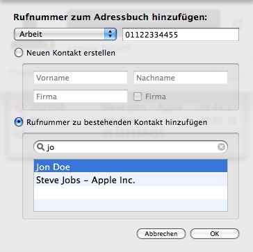 Anrufer, die Sie noch nicht in Ihrem Adressbuch hinterlegt haben, können Sie entweder aus dem Anrufmonitor oder aus der Anrufliste dem Adressbuch hinzufügen. Dazu werden die bereits vorhanden Informationen, wie Rufnummer, oder wenn die Rufnummer per Rückwärtssuche aufgelöst werden konnte, der Name bereits übernommen.Natürlich können Sie eine Rufnummer auch zu einen bestehenden Kontakt hinzufügen.